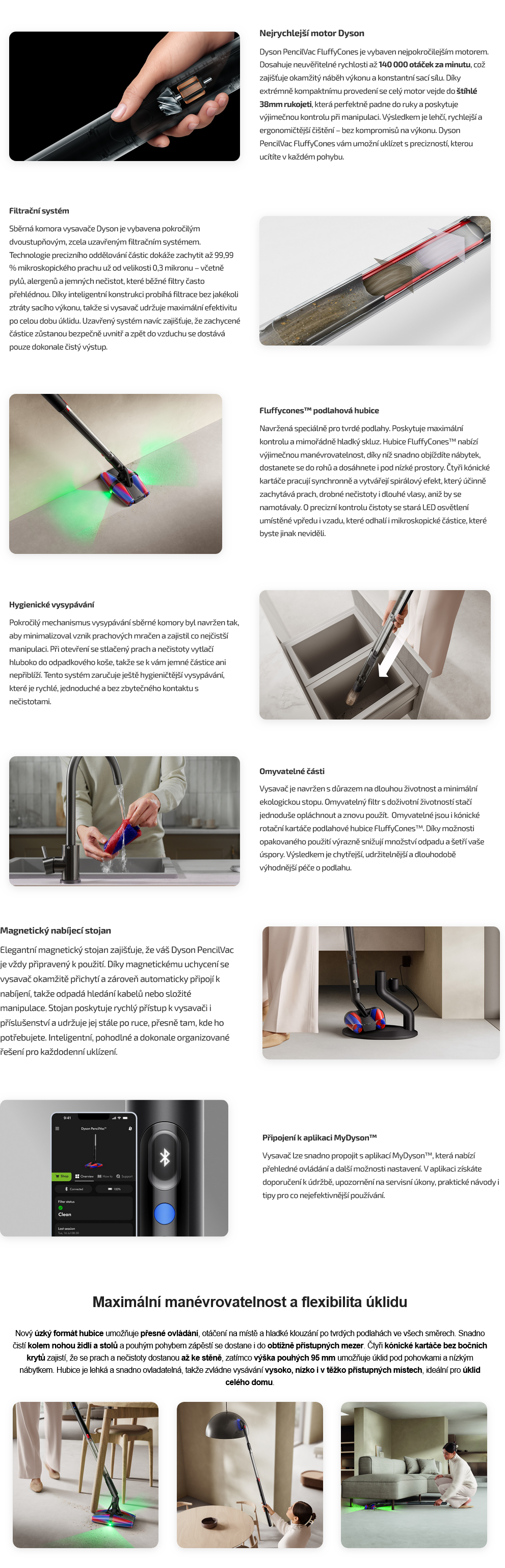 Dosahuje rychlosti až 140 000 otáček za minutu. Navržený tak, aby se vešel do 38mm rukojeti, která dobře padne do ruky. - Fluffycones™ podlahová hubice