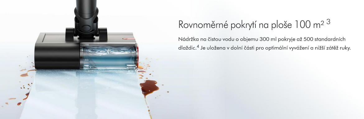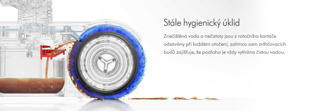 Válec je průběžně zásobován čistou vodou v osmi bodech, což zajišťuje rovnoměrné pokrytí od začátku až do konce úklidu.