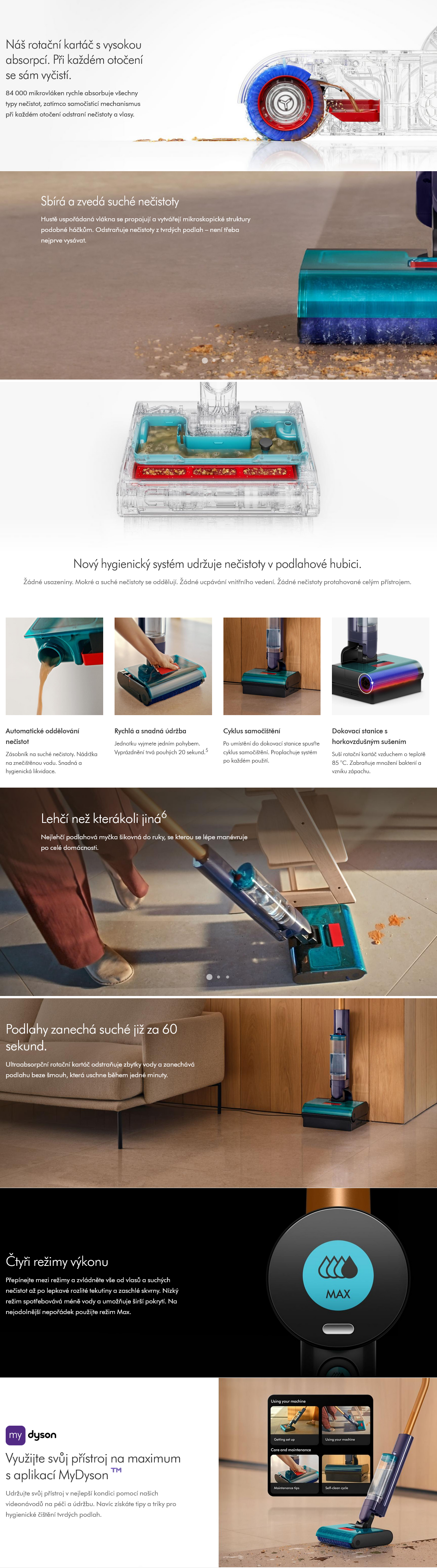 Motor Dyson otáčí kartáčem vysokou rychlostí, aby rychle a účinně odstraňoval nečistoty z vašich podlah.
