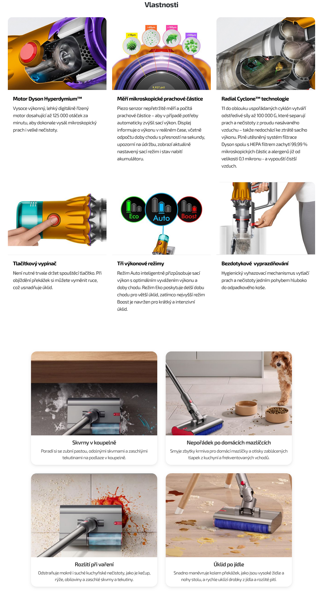 Motor Dyson Hyperdymium™ vysoce výkonný, lehký digitálně řízený motor dosahující až 125 000 otáček za minutu, aby dokonale vysál mikroskopický prach i velké nečistoty. - Piezo senzor měří a počítá mikroskopické prachové částice