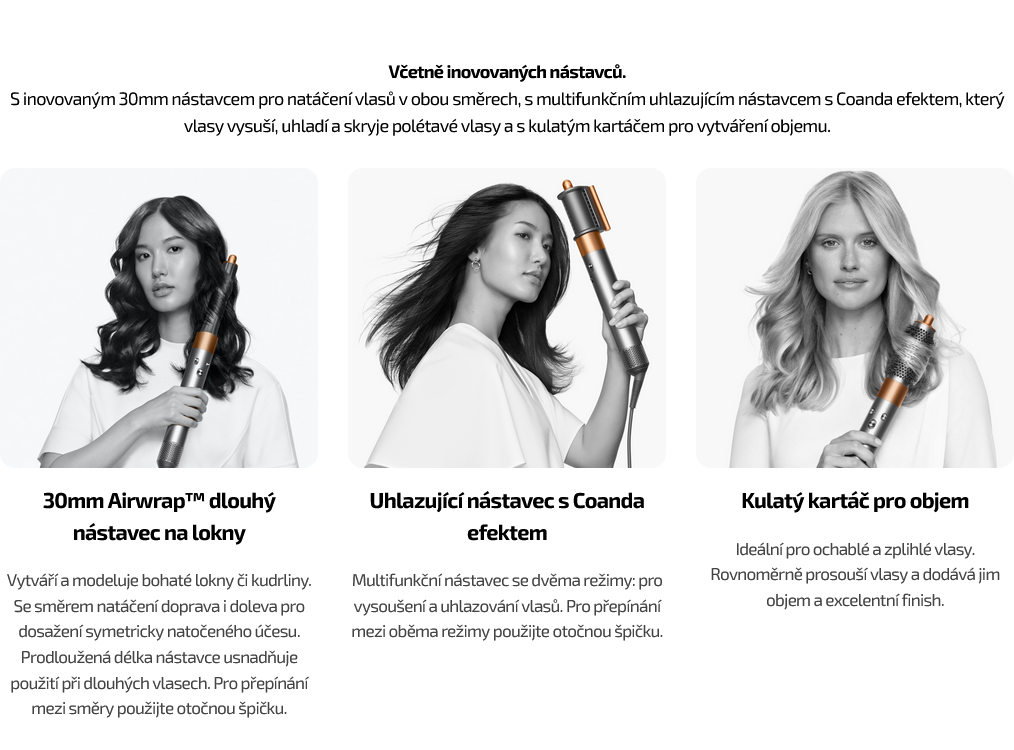 Multifunkční nástavec se dvěma režimy: pro vysoušení a uhlazování vlasů. Pro přepínání mezi oběma režimy použijte otočnou špičku. - 30mm Airwrap™ dlouhý nástavec na lokny