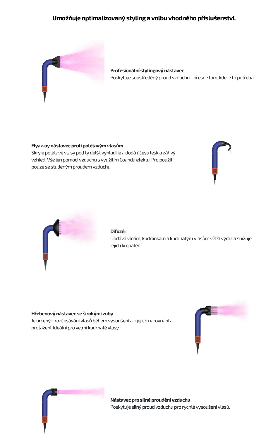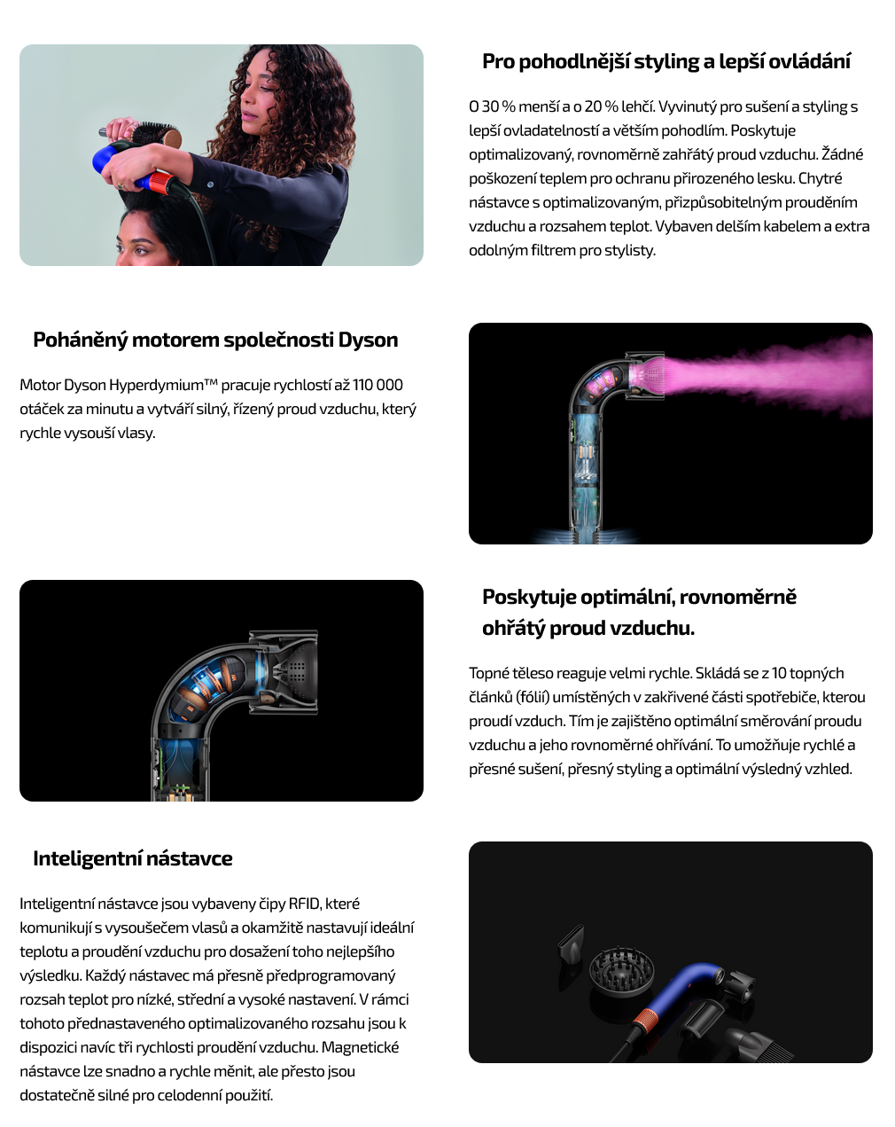 Inteligentní nástavce jsou vybaveny čipy RFID, které komunikují s vysoušečem vlasů a okamžitě nastavují ideální teplotu a proudění vzduchu pro dosažení toho nejlepšího výsledku. - Vyvinutý společností Dyson pro stylisty