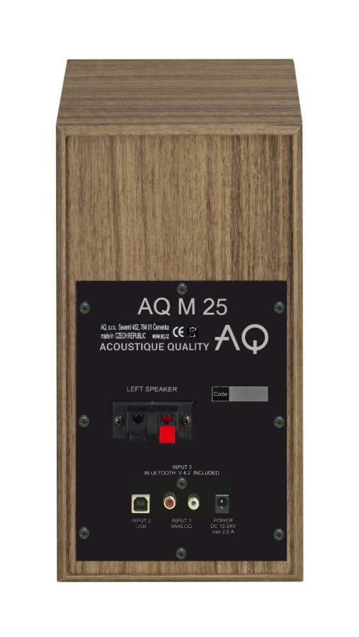AQ M25 multimedia jsou aktivní dvoupásmové reprosoustavy s Bluetooth přijímačem, analogovým vstupem (RCA) a vstupem USB-B pro připojení PC. Vychází z osvědčeného modelu AQ M24, nově s několika inovacemi. Nejviditelnější technickou změnou je rozšíření konektivity, nový výškový reproduktor a inovovaný modul zesilovače třídy D 2 x 30 W, přizpůsobený osazeným měničům. Použity jsou výběrové součástky s dlouhou životností a sofistikovaná výhybka s masivními pájecími body. Reprosoustavy AQ M25 jsou určeny pro menší obytné prostory nebo pracovny a přináší skutečně přesný a kvalitní stereofonní zvuk, který neunavuje ani při dlouhodobém poslechu.