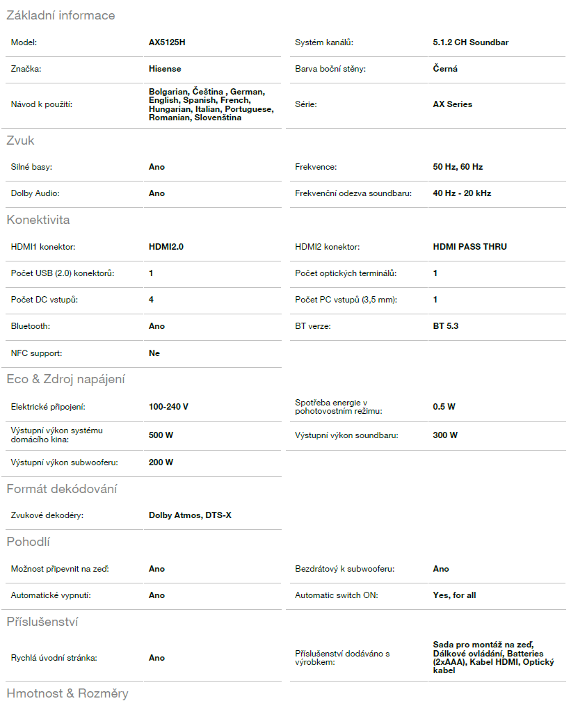 5.1.2 CH Soundbar, Výstupní výkon 500W, Bezdrátový subwoofer a zadní reproduktory,