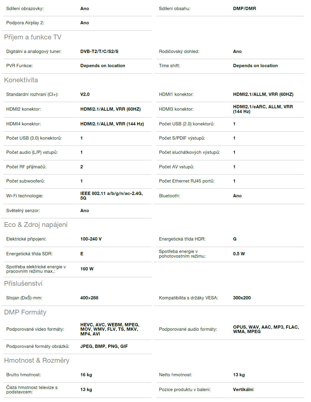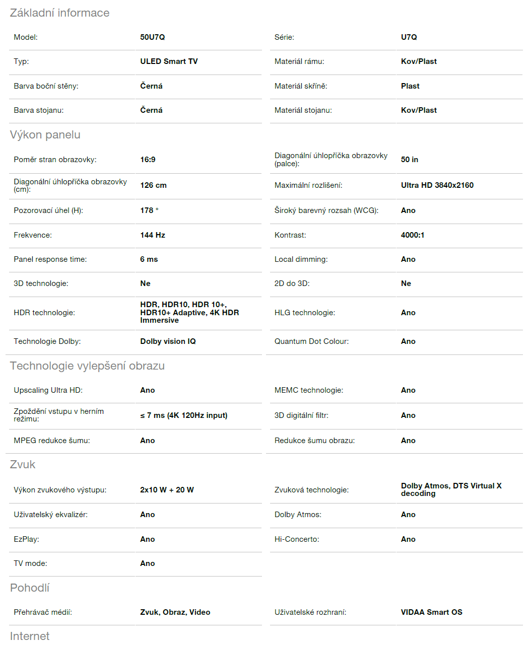 Smart Mini-LED televizor, 126cm, 4K 3840x2160, 144Hz, DVB-T2/T/C/S2/S, energie E, WiFi, BT, systém VIDAA Smart