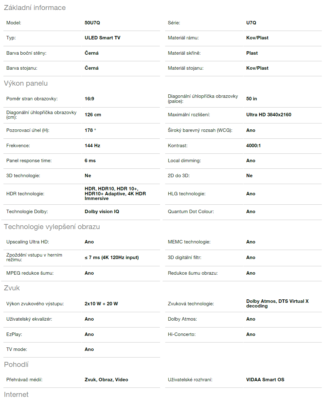 Smart QLED televizor, 108cm, 4K 3840x2160, DVB-T2/T/C/S2/S, WiFi, BT, energie E, ovládání hlasem, systém VIDAA Smart