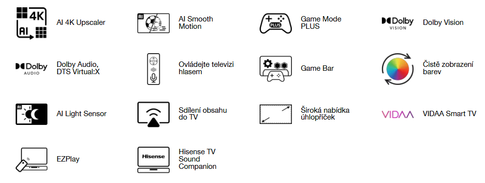 Vyzkoušejte VIDAA Voice a posuňte ovládání televize na novou úroveň pohodlí. Jediným stisknutím tlačítka aktivujete hlasové příkazy. Snadno si vyhledejte opblíbený obash, procházejte pořady nebo změnte nastavení televize. To vše i v Češtině. Televize taky podporuje hlasového asistenta Amazon Alexa.