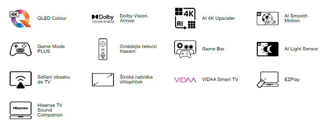Vyzkoušejte VIDAA Voice a posuňte ovládání televize na novou úroveň pohodlí. Jediným stisknutím tlačítka aktivujete hlasové příkazy. Snadno si vyhledejte opblíbený obash, procházejte pořady nebo změnte nastavení televize. To vše i v Češtině. Televize taky podporuje hlasového asistenta Amazon Alexa.