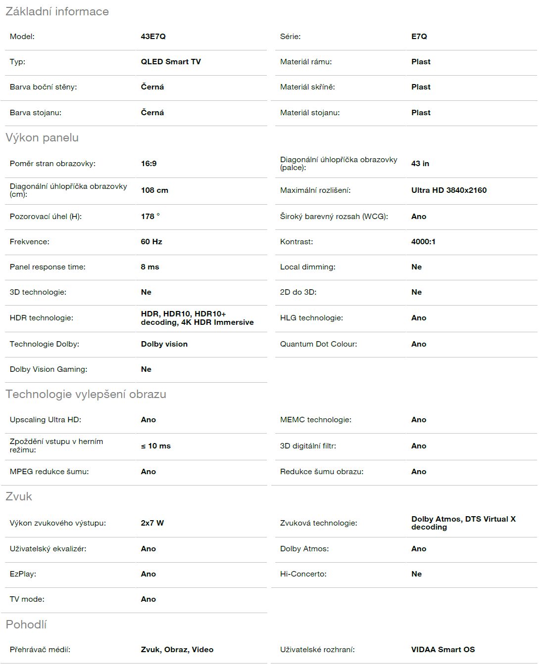 Smart Qled televizor, 108cm, 4K 3840x2160, energie E, systém VIDAA Smart