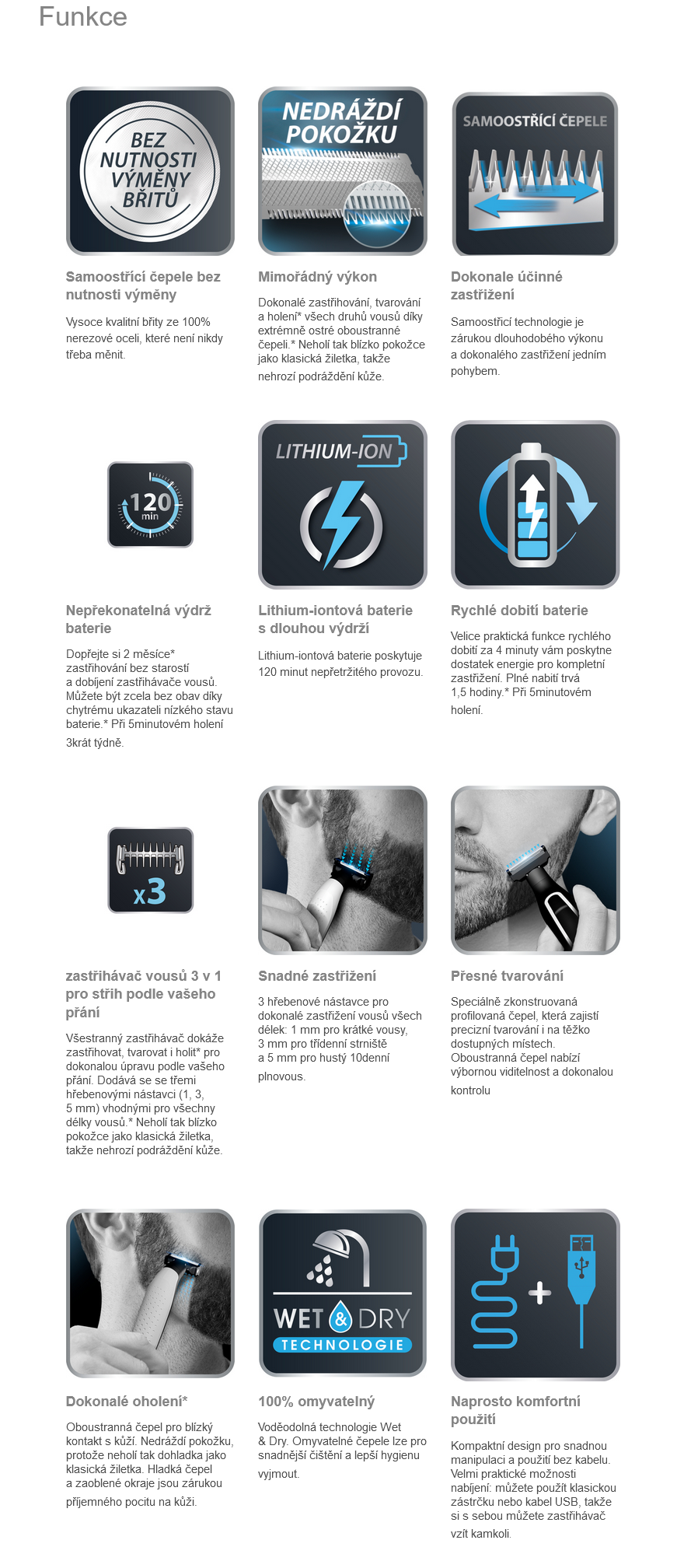Hybridní zastřihávač vousů - pro zastřihování, tvarování a holení, 100% omyvatelný, provoz 120min, nabíjení 1,5hod,