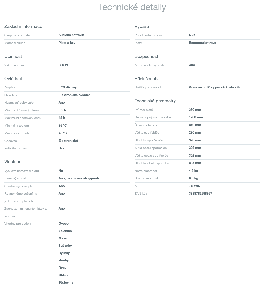 Sušička potravin, 580W, Elektronické ovládání, 35-75°C, Časovač, 6x kovové plato,