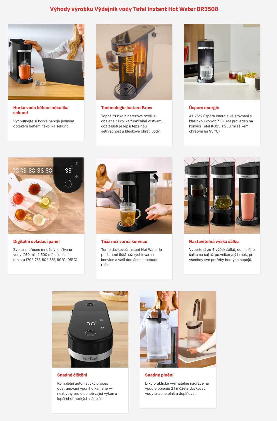 - Až 25% úspora energie ve srovnání s klasickou konvicí* (*Test proveden na konvici Tefal KO25 s 250 ml šálkem ohřátým na 95 °C)