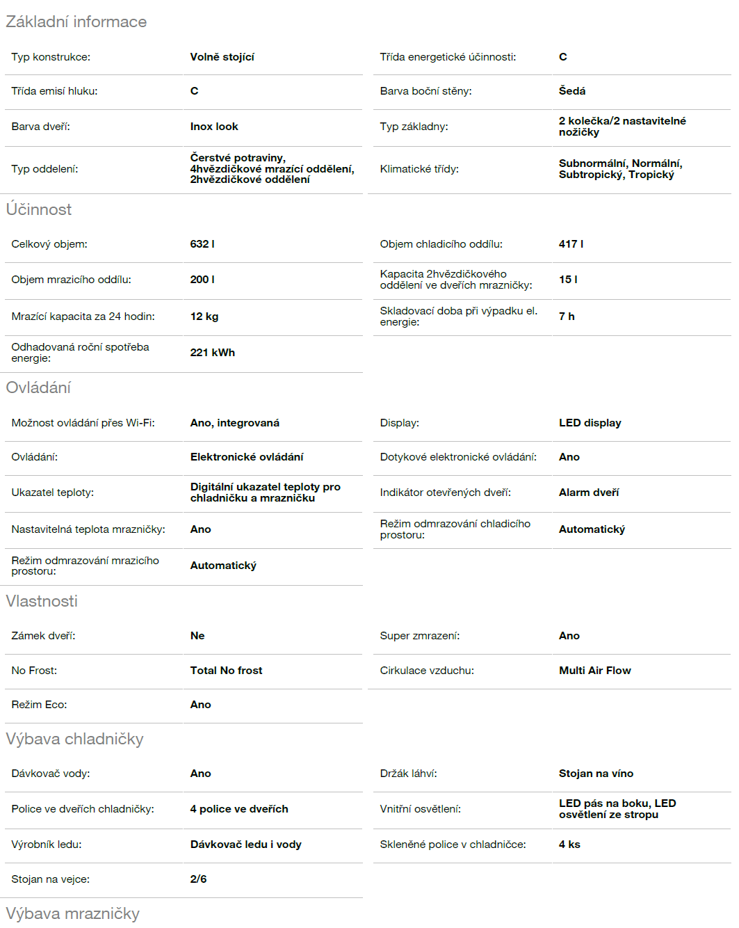 Chladnička s mrazákem - Amerika, výška 180cm, chlad.417l/mr.200l, energie C, Dávkovač ledu i vody, WiFi, Total No frost, Multi Air Flow,