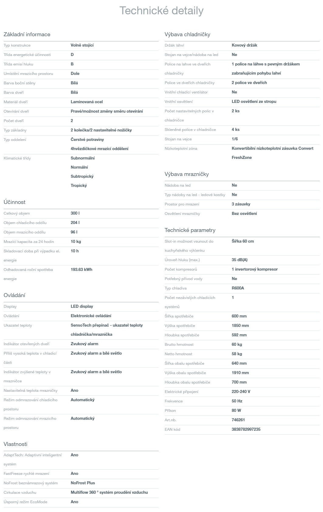 Chladnička s mrazákem dole, výška 185cm, chlad.204l/mr.96l, energie D, 35dB, NoFrost Plus, elektronické ovládání,