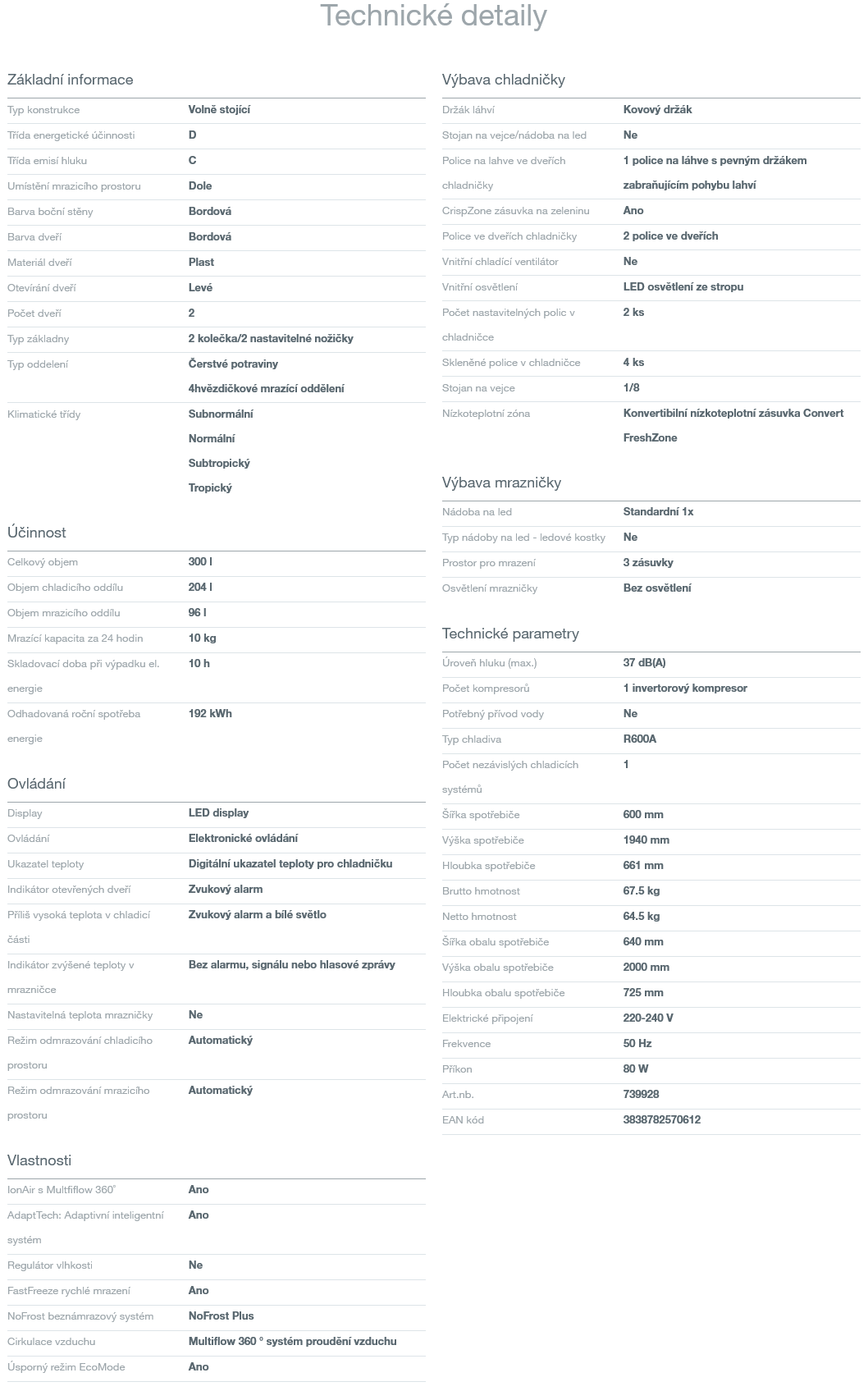 Chladnička s mrazákem dole, výška 194cn, chlad.204l/mr.96l, NoFrost Plus, energie D, 37dB, Elektronické ovládání, barva Bordová