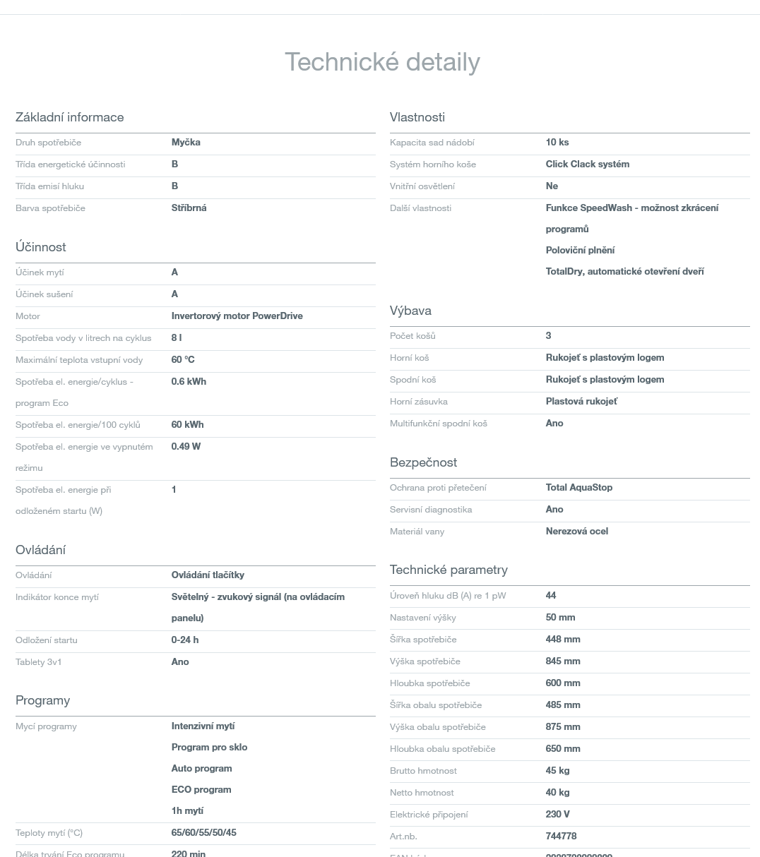 Myčka nádobí, 45cm, 10sad, 5programů, 5teplot, energie B, 44dB, TotalDry sušení, příborová zásuvka, Invertorový motor