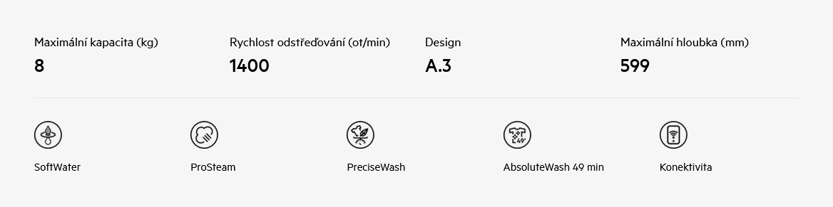 Pračka předem plněná, 8Kg, 1400ot/min, ProSteam, WiFi - Konektivita, Jet – funkce přímého sprchování