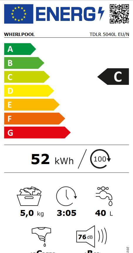 - Vážená spotřeba energie v kWh na 100 pracích cyklů. Energetický štítek (EU 2017/1369): 52