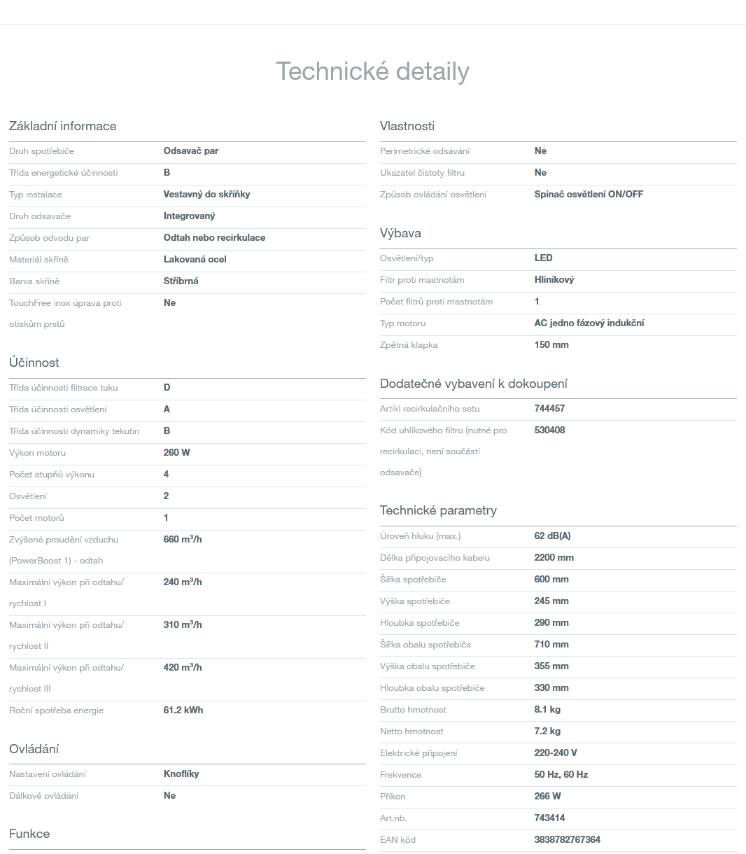 Vestavný odsavač par - Integrovaný, výkon 240-660 m³/h, hlučnost až 62dB, tlačítkové ovládání
