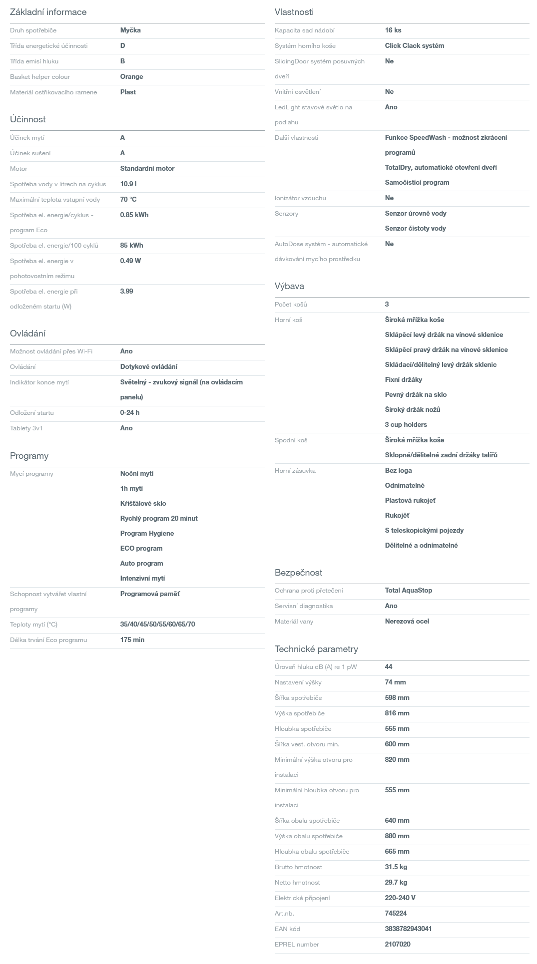 Vestavná myčka - INTEGROVANÁ, 60cm, 16ks nádobí, energie D, 8programů, 8teplot, dotykové ovládání, WiFi,